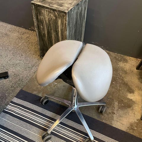 Kunto todella hyvä. Mukana saa sini-mustat ja koko mustat nahkapäälliset. Säädettävä korkeus. Istuin osa liikkuu joka suuntaan, joten tosi hyvä alaselälle. Mukava istua pidempiäkin aikoja. Nouto Tammelasta.