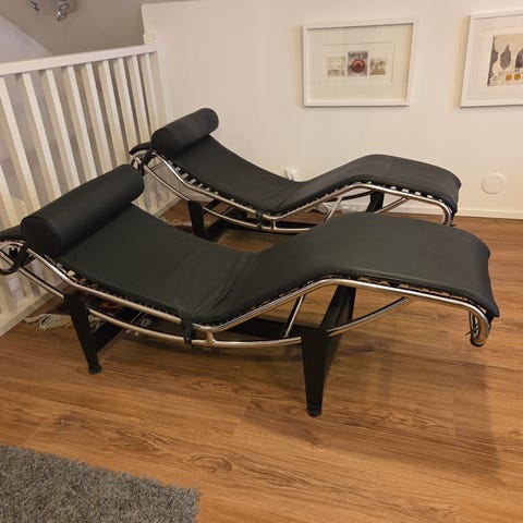 Le Corbusier tyyppinen musta nahka divaani. Kromirunko. Tuoli lepää jalustan päällä, joten helppo vaihtaa istuinkulmaa. Niskatyynyssä on lenkin kohdalla pieni repeämä. Tyynyn saa myös otettua pois tai siirrettyä taakse. Itse en ole sitä käyttänyt. Jalkaosassa oikeassa reunassa kulumaa nahan pinnassa (edellisellä omistajalla ollut kissa) Lampaantalja ei kuulu kauppaan. Lepotuoli. Divaani. Nouto. Saa tosiaan nostamalla erikseen jalustan ja istuinosan.
