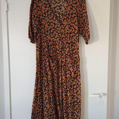 Kukkakuvionen mekko lyhyillä hihoilla. Pituus 97, k-k=47cm ja hihan pituus