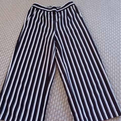 Kuvien mukaiset vaaleansiniset toppahousut. Vyötäröllä kuminauha ja kiristysmahdollisuus kuminauhoilla. Avattavat lahkeensuut. Lahkeissa vaaleaa tahraa ja pientä rispaantumista. Lisäksi toisen lahkeen polvessa myös vaaleaa likaa (näkyvät kuvissa). Kokolapussa S, mutta mielestäni ovat pientä S-kokoa, joten voivat myös mennä lapselle hyvin.