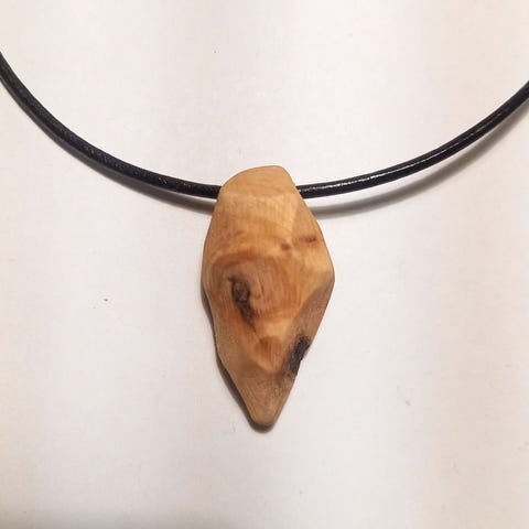 Myydään itse tehty puinen kaulakoru nahkanauhalla. Nauhan pituus noin 60cm. Puuosan korkeus noin 3cm. Käsitelty elintarvikeystävällisellä öljyvahalla.