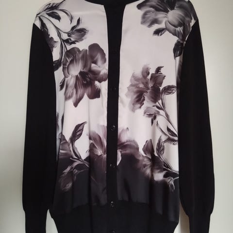 Upea, mustavalkoinen neuletakki. Taskut.