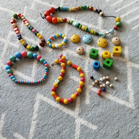 Materiaalina ruskeat puuhelmet.