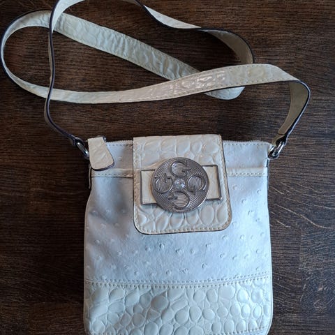 Guessin aito olkalaukku. En osaa sanoa onko nahkaa vai keinonahkaa, joten laitoin ilmoitukseen keinonahan.