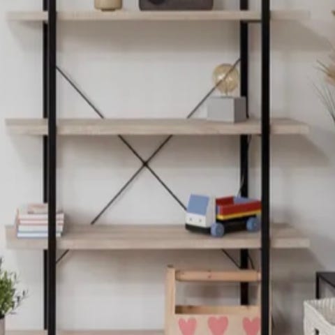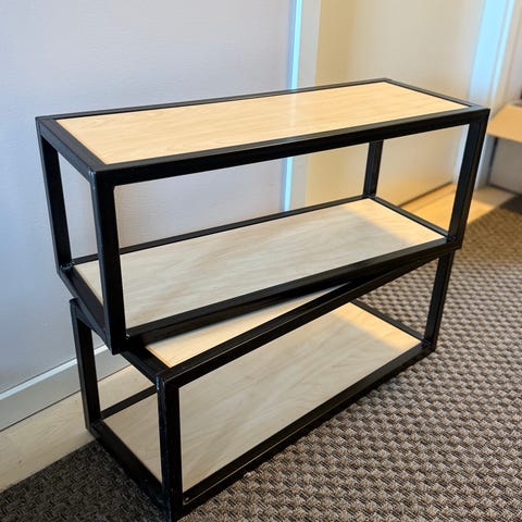Kuvan grafiitinharmaa lp-levyille teetetty avohylly. Kuvassa alhaalla lehtiä ja ylhäällä mikseri kun levyt loppui kesken. Tukeva ja jämäkkä.