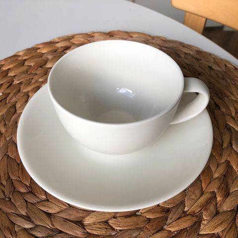 Kupin tilavuus on 2,6 dl ja halkaisija 10 cm, aluslautasen n. 16 cm.