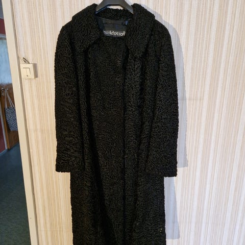 Kunnostettu krimiturkki noin koossa 36. Kunnostuksessa linjaa kavennettu vyötärön kohdalta, sekä kiinnitykset uusittu.