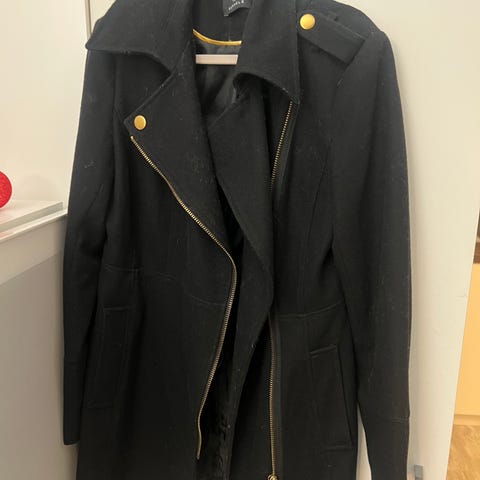 Myytävänä musta-valkoinen vetoketjullinen villakangastakki.