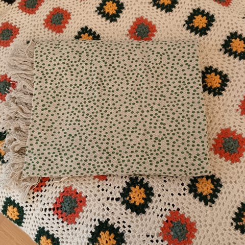 Käsityötä arvostavalle. Itse rakkaudella tehty chunky -viltti. Koko 125 x 110 cm. Kaunis esim. nojatuolin tai sängyn reunalle. Koska itse tehty, löytyy joitain epätäydellisyyksiä (kuten ks. kuva 6). Fleece -kangasta.