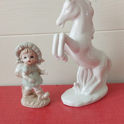 Erilaisia hevosfiguureja. En tiedä mitä materiaalia mutta särkyviä. Pari hevosta saanut osumaa jotka on liimattu paikalleen. Ei toridiiliä.