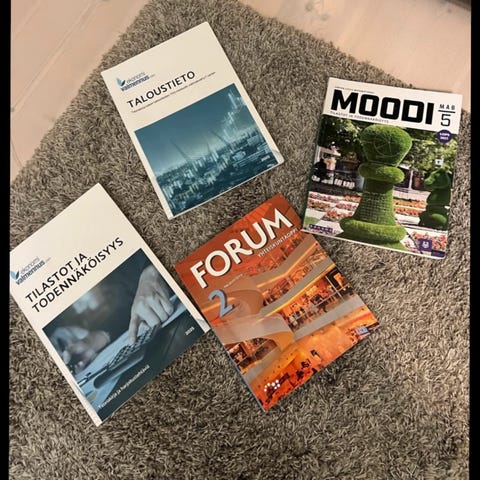 (Historia ihminen ympäristön ja yhteiskuntien muutoksessa, Tilastot ja todennäköisyys sekä taloustiedon kirjat) ja 4kpl pääsykokeita