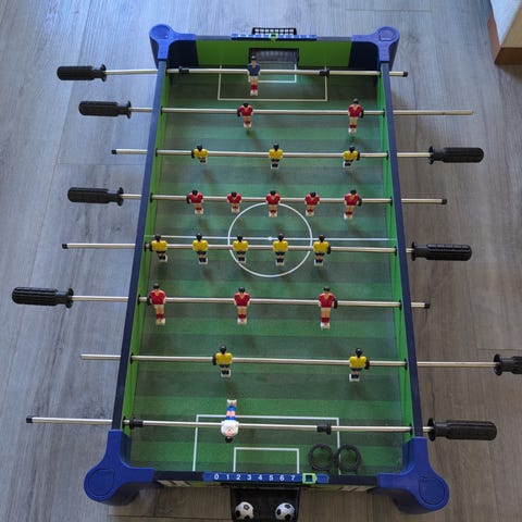 Pöytäjalkapallo, jossa rullataan matolla pallokuulia.