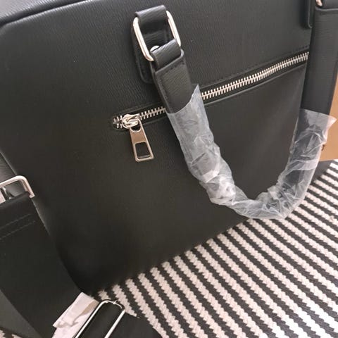 Täysin käyttämätön laukku, jonka saa avattua kokonaan auki, sisältää useita eri taskuja