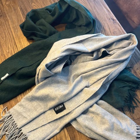 Kaksi käsin kudottua , värikästä kaulahuivia.