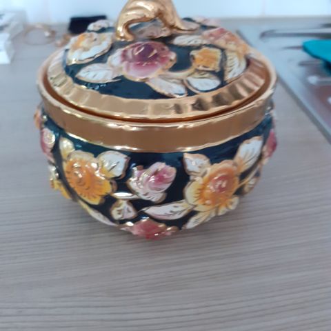 Ihanan värikäs papukaijakuvioinen posliinirasia säilytykseen koruille tms. Halkaisija 9cm ja korkeus 4cm. Tämä on ilman leimoja vastaavanlainen löytyy leimoilla Takahashi "Tropicale". Kyseessä Yhdysvalloissa toimiva pieni liike, joka tämän tehnyt. Ehjä mutta pientä kulumaa joka huomioitu hinnassa.
