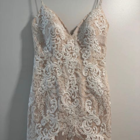 Luonnon valkoinen häämekko koossa M. Mekossa on lyhyet hihat ja koristeellinen pitsi- ja nappiyksityiskohta yläosassa sekä takana. Mekossa kiinni tyllialushame. Mekko on pitkä ja alle sopii vanne alushame.