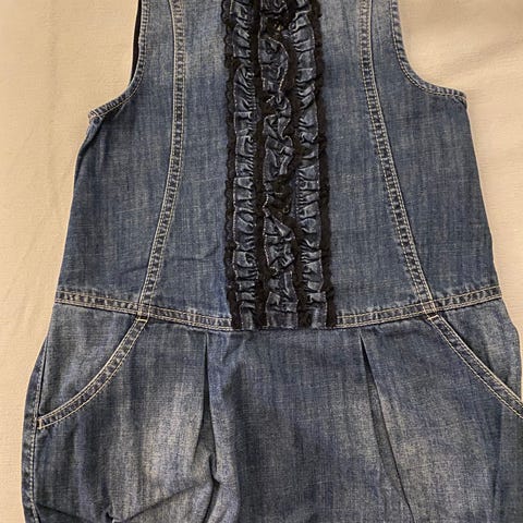 Hyvässä käytetyssä kunnossa oleva Benetton Jeansin koon XS (110) farkkumekko. Napitus edessä, avotaskut sivussa.