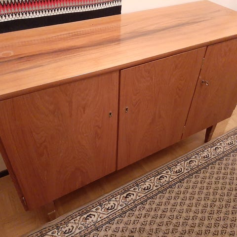 Myydään kaunis hyvä kuntoinen vintage senkki. Oikean puoleisen oven takana yläosassa on kaksi vetolaatikkoa, ja kahden vasemman puoleisen oven takana tilan jakaa yksi hylly. Senkki on pinnoiltaan tosi siisti.
