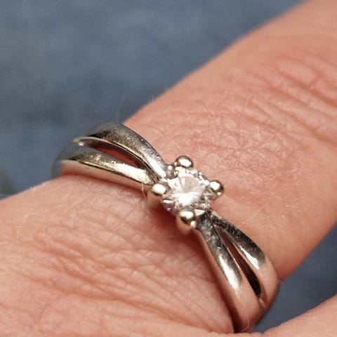 Sormuksessa yksi isompi timantti keskellä ja sivuilla pieniä n.18 per. sivu.