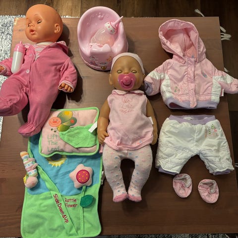 Ammetta ja nukkea testattu, amme pitää jotain ääniä ym. Jäänyt käyttämättömiksi kaappiin.