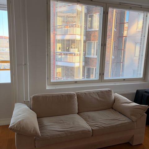 Myynnissä kahden istuttava harmaa sohva, jonka muoto erottuu muista harmaista sohvista. Edelliset omistajat toivat sohvan Amsterdamista ja se on ollut minulla 3 vuotta. Varma en ole, mutta saattaisi olla Baenksin Bayside. Sohvalla saa kivan pienen takanojan ja sillä on supermukava istua. Leveälle käsinojalle saat asetettua kahvikupin kätevästi.
