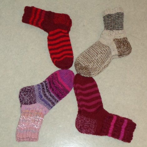 pitkä vartiset siniset villasukat, joissa oranssi ja valkoinen raita.