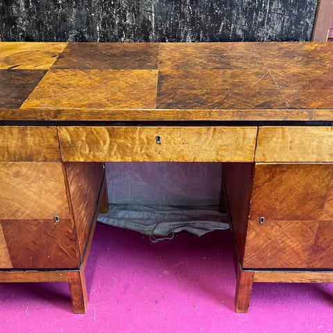 Myyntiin siro vanha teak kirjoituspöytä. Esiin vedettävä kirjoitustaso. Välitilan huurrelasien takana mustat lasihyllyt. Neljä laatikkoa. Pöydän päällä isohko, täysin ehjä peili (sivupeilit kadonneet vuosien varrella).