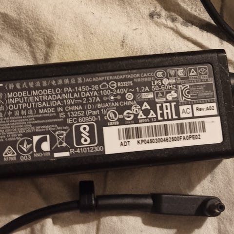 Acer läppäri laturi tiedot näkyy kuvassa.