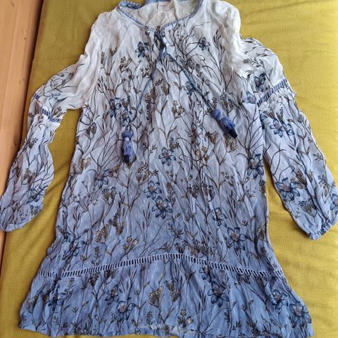 Hyvin kevyt, hieman läpikuultava tunikapaita 38/40 vaaleansininen/lila kuviollinen. 3/4 hihat. Etupuolella smokkirypytyskoriste ja nappikaistale 24 cm. K-k 110 cm. Pituus 74 cm. 100 % polyesteri. Pm. 7,90e.