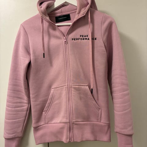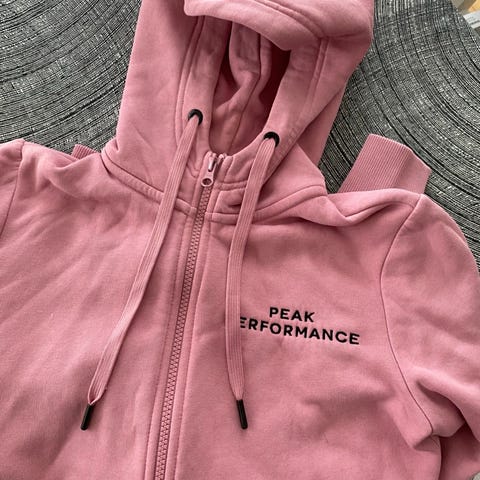 Muutamasti käytetty ruskea peak performance huppari. Vaaleanpunaiset yksityiskohdat.