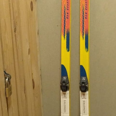 Kuluneet perinteisen tyylin sukset joiden pohjissa naarmuja. Kyllä näillä silti paremmin hiihtää kuin ilman suksia 😊