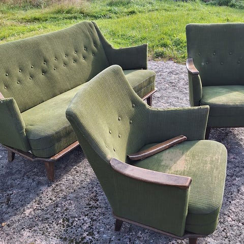 Myydään sohvaryhmä hyvässä kunnossa. Sohva, kaksi lepotuolia ja sohvapöytä. Pieni kulumaa pöydässä ja pieni naarmu tuolin käsinojassa. Sohva on ostettu 80- luvulla ja todennäköisesti 60-70 luvulta.