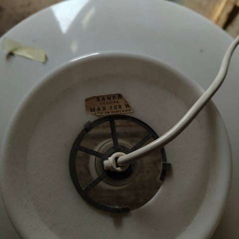 Sanlux Lighting 7100 max 60 w lasinen sisustusvalaisin pistokkeella, 20 x 20 cm. Hinta noudettuna. (Pieni särö pyöreässä reunassa, joka jää metallisen kuvun sisäpuolelle.)
