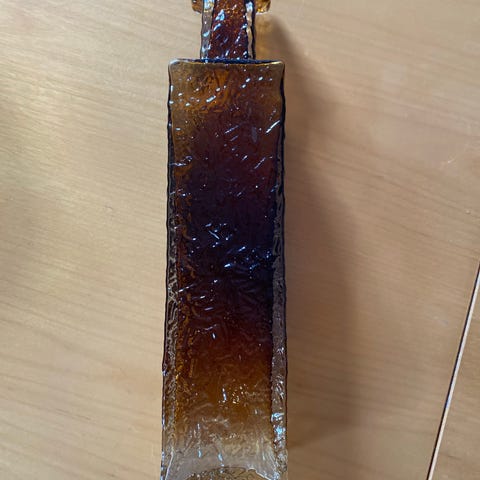 Maija Carlssonin suunnittelema lasinen maljakko. Valmistaja Oy Kumela, 1950–1959