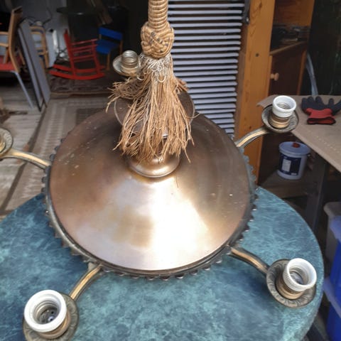 Vanha messinkinen kattovalaisin pistokkeella. Messinki / maitolasi. Kiillotusta ja puhdistusta vailla. Nouto Nokian korvolasta.