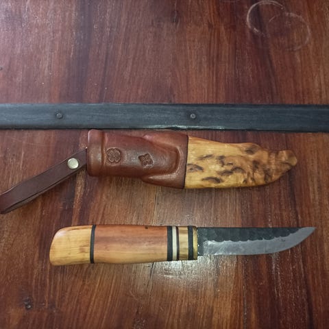 Käsintehty veistelypuukko hauskalla pöytätupella.
