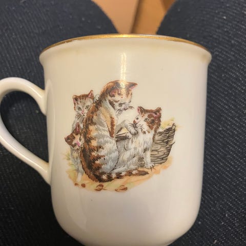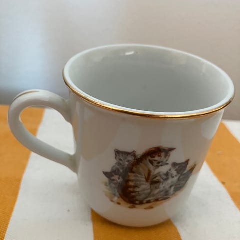 Myydään kaunis vanha posliininen muki, joka on litteä kuin taskumatti. Vanhaa tsekkiläistä posliinia. Hyvässä kunnossa, ehjä ja siisti. Korkeus 13,5cm. 9cm leveä, syvyys 5cm.