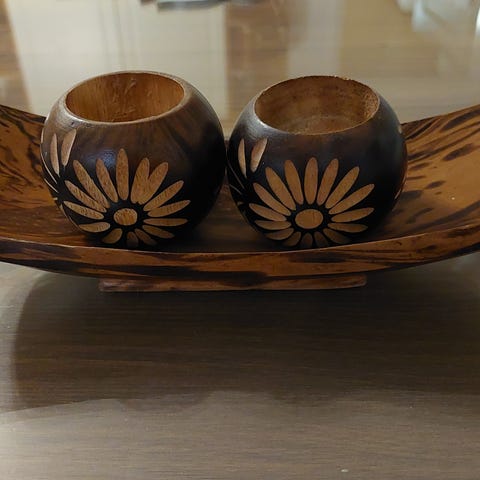 Myydään iso, viljellystä tiikistä käsin valmistettu uusi tarjotin. Halkaisija 42-43 cm (riippuen kappaleesta) , korkeus 8cm. Pohjan paksuus 2cm. Myynnissä viisi tarjotinta, joista yksi on musta ja neljä luonnon väristä. Käsitelty mehiläisvahalla, jossa on valkoista pigmenttiä. Valmistusmenetelmästä johtuen tarjottimissa on halkeamia, ei vaikuta käyttöön eikä lujuuteen. Valmistettu Thaimaassa.