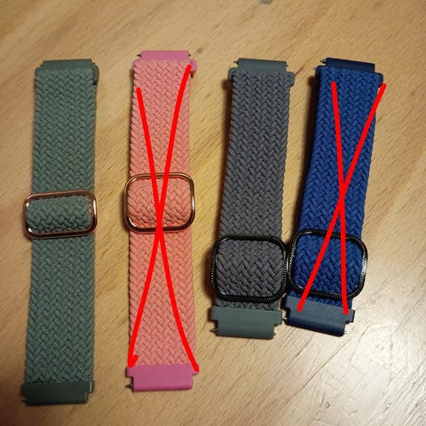 22mm: Vihreä, oranssi, musta, harmaa, punainen, tummansininen ja mustaharmaa raidallinen