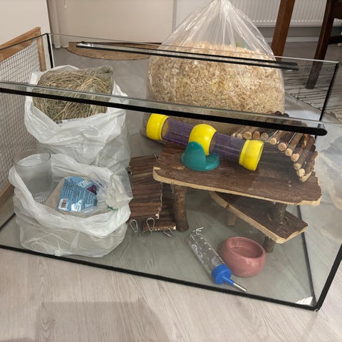 Lemmikin kuoltua myyntiin lähtee kaikki sen tarvikkeet. Paketti sisältää lasisen terraarion, koko 35x40x70, kaksi pienempää muovista kuljetushäkkiä, erilaisia tarvikkeita, kuten vessakoppi, juoksupyörä, ruoka-ja vesiastia sekä loput vessahiekat ja kuivikepurut. Lasiterraariossa pieni halkeama joka ei haittaa käyttöä. Sinisessä häkissä on kansi rikki/teipattu, joten toimii lähinnä tilapäiskäytössä esim.häkin siivouksen ajan. Pieni vihreä häkki sopii lemmikin kuljetukseen. Nouto Mäntsälästä. Koko paketti vain 50e.