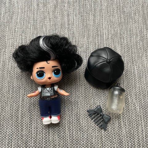 Leikkejä vaille jäänyt iso lol-nukke tavaroineen ja laatikoineen.