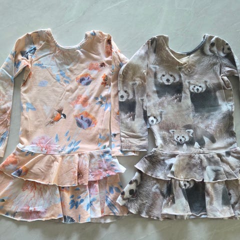 Myydään pakettina Gugguun frillamekkoja, kokoa 92. Toinen kuosi on nimeltään Morning Dew ja toista en muista. Toisen pohjaväri vaalean roosa ja toisen valkoinen. Roosassa mekossa luontoaiheinen printti ja toisessa hevosia.