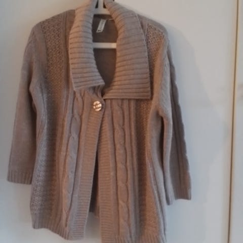 Myydään polvitaipeeseen asti ulottuva pehmeä neuletakki. Kokomerkintä L, vastaa ehkä n M.