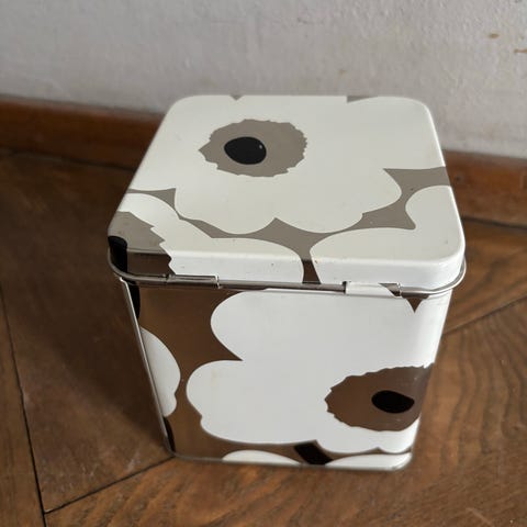 Marimekon Unikko puna-musta peltipurkki. Kansi saranoilla. Hintaa vaikea määritellä kun tätä väriä ei liene enää myynnissä.