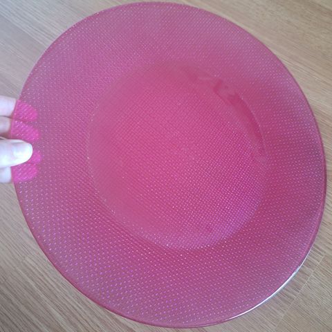 Myydään muutaman kerran käytetty punainen lasilautanen.