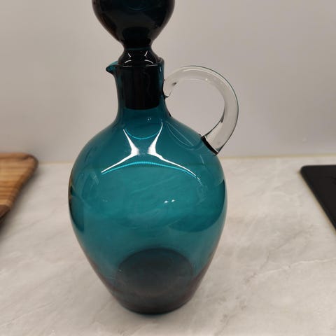 Nuutajärven Näppylä karahvi. Saara Hopea. Turkoosi väri.
