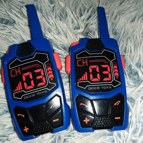 Toimiva radiopuhelinsetti leikkiin. Kun puhelimen laittaa päälle kuulu kohiina, mutta äänen kuitenkin eroittaa selvästi. Mukaan ei tule paristoja. Puhelimet toimivat kuitenkin aivan normaaleilla 9 V paristoilla.