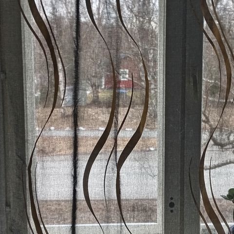 Valoverho, jossa ruskeita kuvioita, kork.150cm, leveys 164cm, ehjä.