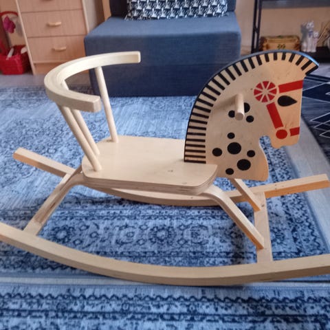 Puinen keinuhevonen, häntä hävinnyt mutta muuten kunto hyvä, vain nouto Espoosta.