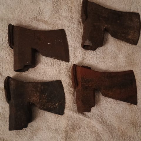 Seinällinen käsin restauroitua/ kunnostettuja/ muokattuja laatukirveitä ja vesureita ym.